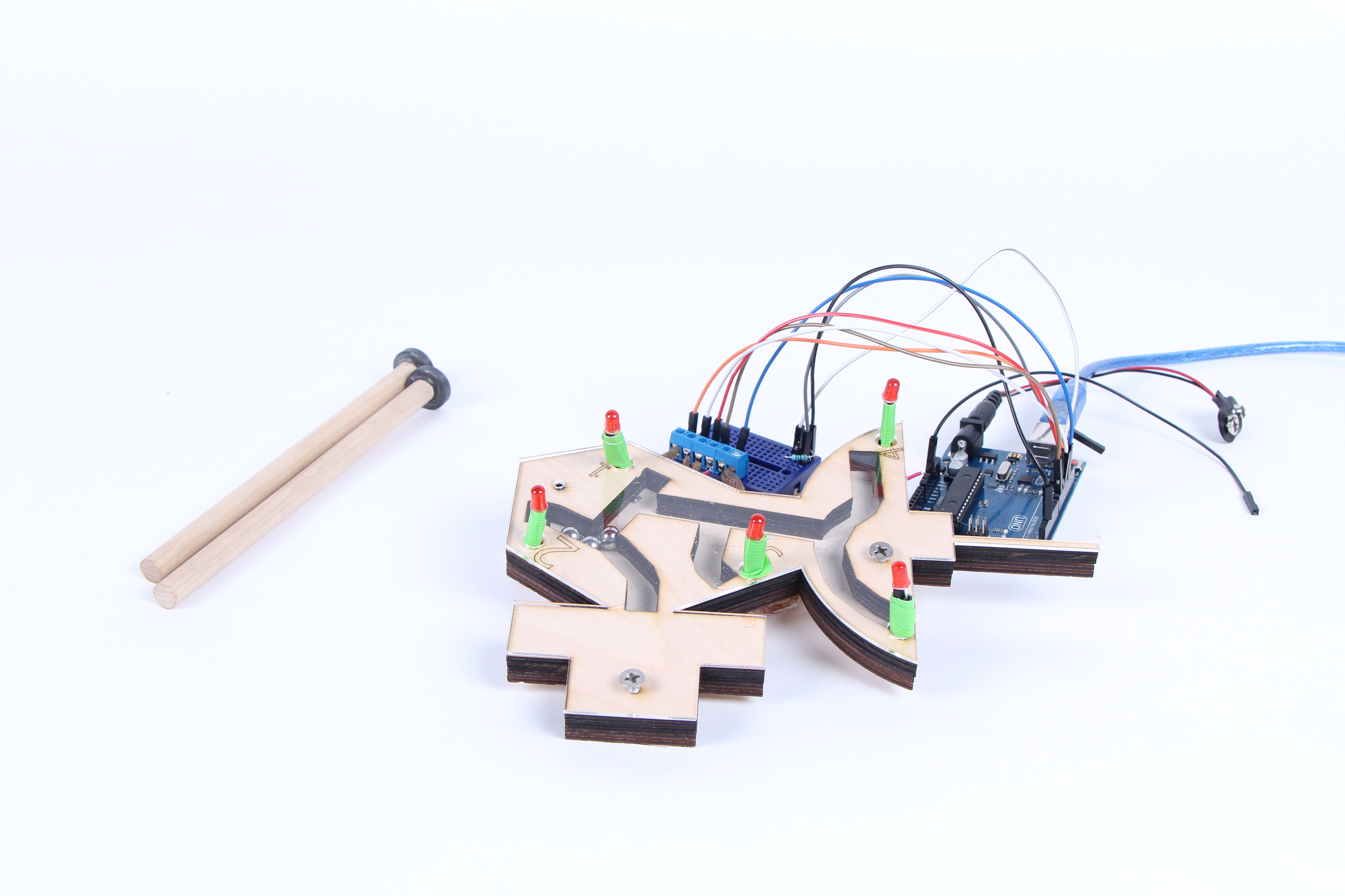 The satellite board game is an interactive two person board game for children to learn about simple circuits and resource management as well as sustainable technology. This game takes place on a satellite with pathways winding throughout. 4 magnetic balls in the interior is moved by a stick with a magnet on the end around to the different locations. When you start the game an led starts blinking and you have to move the correct amount of marbles to the led and hit the button before it stops blinking. If it stops before you finish you lose. The game is played with a partner and whoever lasts the longest wins.